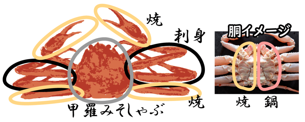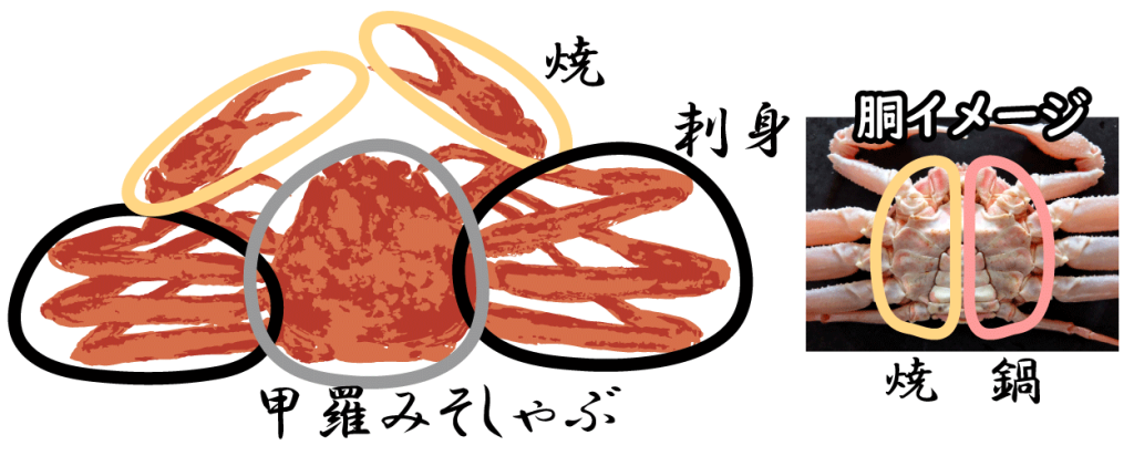 ・小鉢(かにみそ) ・かに刺(しゃぶしゃぶでも) ・かにすき(かに鍋) ・ゆでかに ・焼かに ・甲羅※ ・雑炊 ・デザート